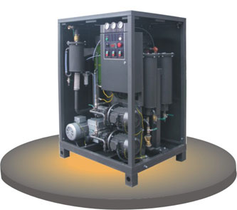 El aire tratado que entra en la cámara con una corriente ascendente quita los gases y vapores de agua de la superficie de aceite, asismismo, secándolo. La bomba de vacío hace pasar el aire húmedo a la atmósfera a través del separador de aceite.El aceite tratado se dirige al receptáculo de aceite limpio.